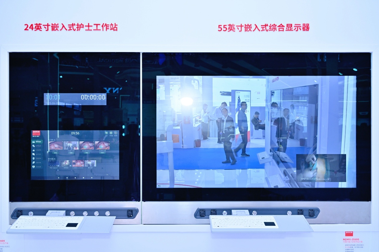 巴可24英寸手术室嵌入式工作站 MDMX-22400和55寸手术室嵌入式工作站MDMX-25500在展会上的亮相,成为焦点。两款工作站均集成了 Nexxis 解码器,具有强大的术中影像集成管理和控制功能,支持多屏协同工作模式,满足不同场景对屏幕尺寸的差异化需求,又能为手术团队提供更宽广、更清晰的视野。其中,前者采用全高清触控显示屏,支持整个手术室工作人员组合和查看多个图像,轻松便捷;后者屏更大,分辨率更高,可通过WorkSpot 功能实现六分屏,与更能与远程 PC 视频源交互,为复杂手术提供跨地域的会诊支持。